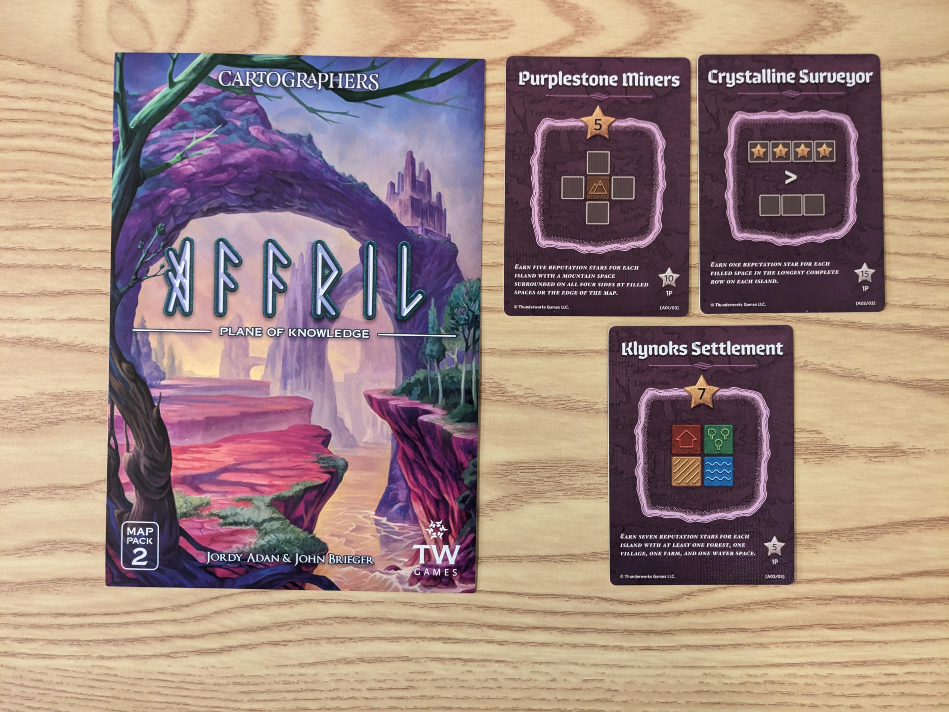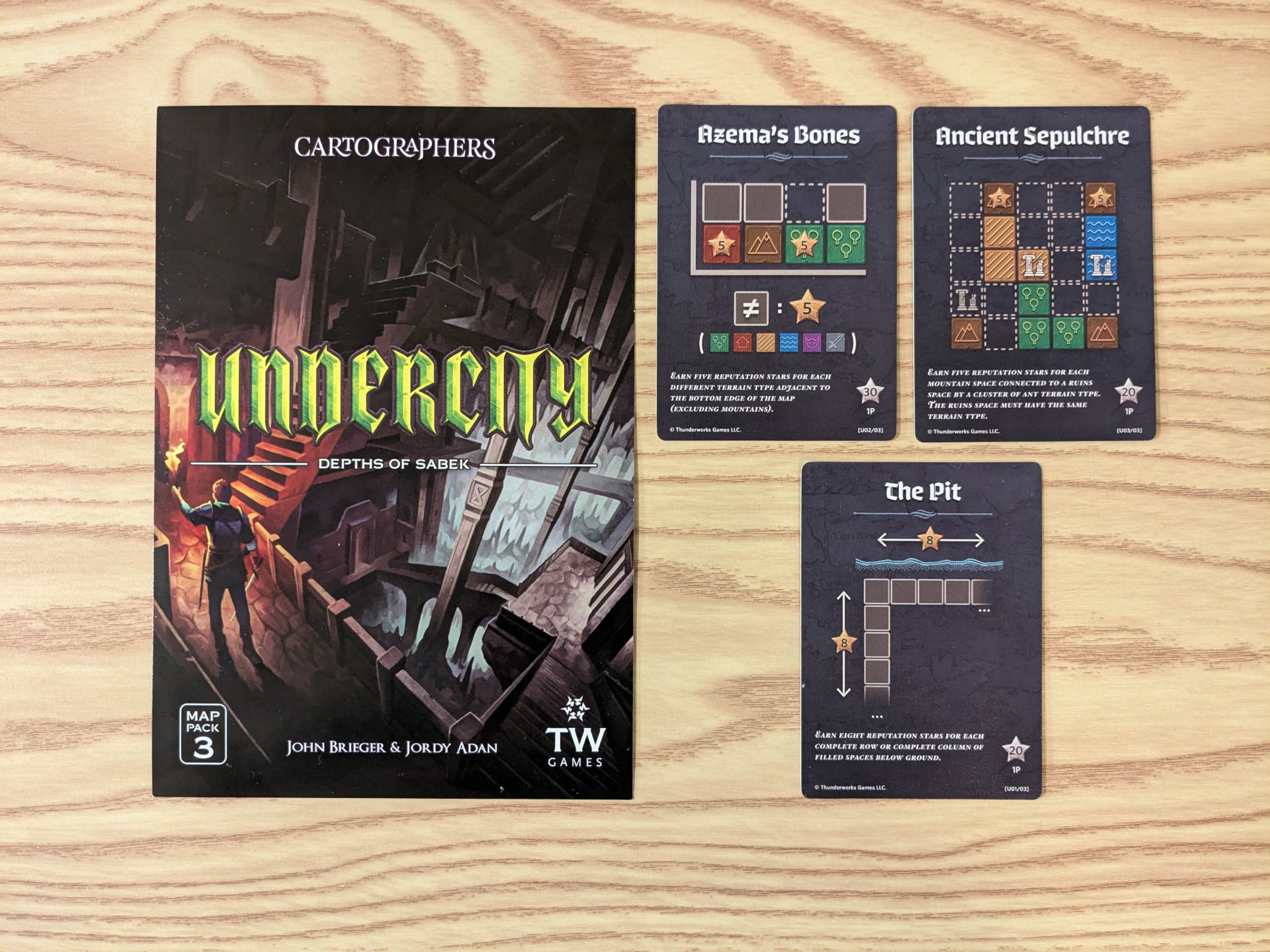 In the Undercity map pack, you have two new map variations where you’ll be charting the underground as well with three new edict cards for scoring conditions specific to these maps. The new mechanic in this map pack is that shapes drawn underground must connect to a shape drawn previously as though you are tunneling as you explore. The tunneling felt thematic and changes up your tile placement strategies compared to other maps in the series. I just had two issues with this map pack. First, it’s hard to see when drawing with color on the blue underground cells. I wish the shading on the map sheet would have been lighter like Affril. Second, the solo rules are unclear in terms of how ambushes should be resolved. Do ambushes need to connect to another shape based on the map’s new placement rule or do they follow the base game rules?